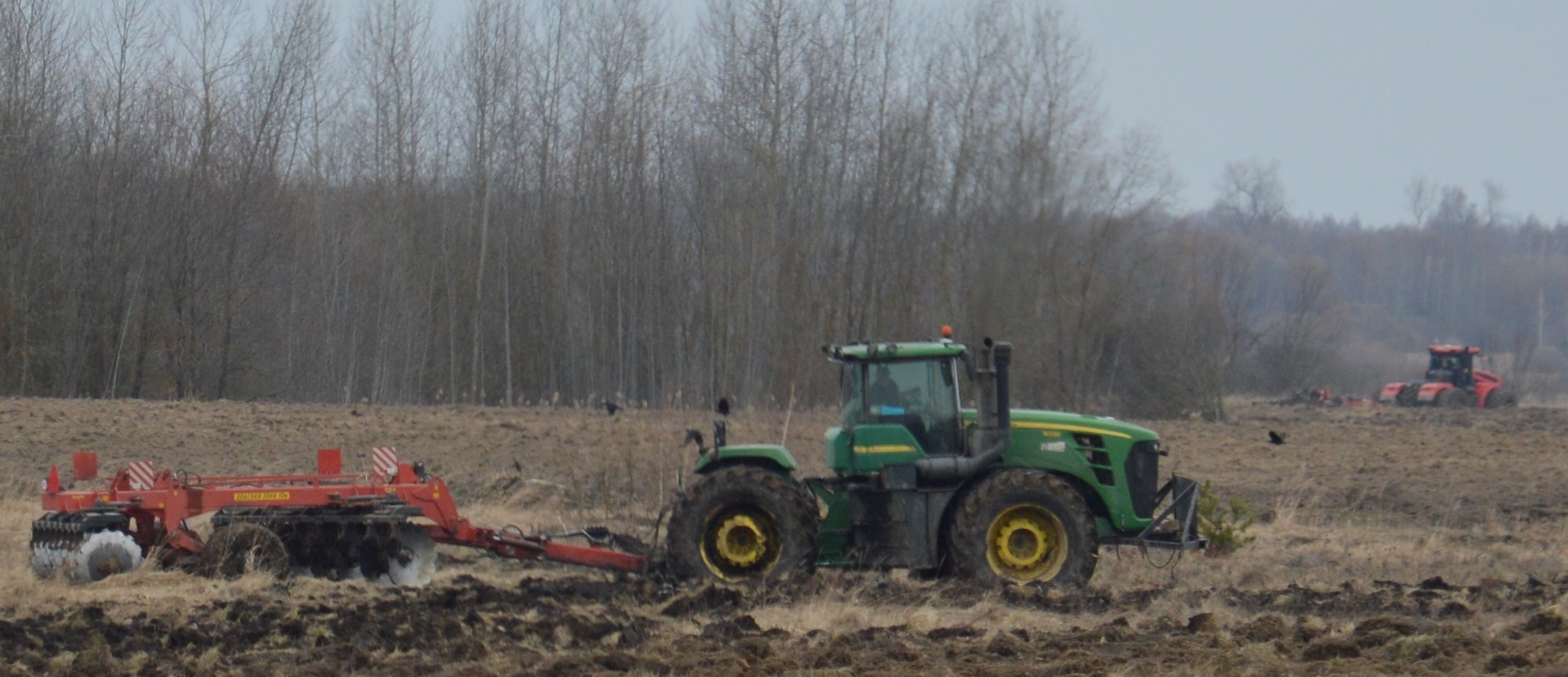 Весной, с наступлением подходящих условий сельхозпредприятия более активно проводят трудоемкие работы по освобождению земельных участков от древесно-кустарниковой растительности. В Гордеевском районе продолжаются работы по вводу неиспользуемых земель. Недалеко от деревни Стругова Буда за работай мы увидели мощную технику. Два мощных Джондира с тяжёлыми дисками, предусмотренными для первичной обработки залежных и закустаренных земель, работали на полную мощность. Недалеко от них, в кустарнике, на выкорчёвке древесной растительности работал экскаватор Хёндай.