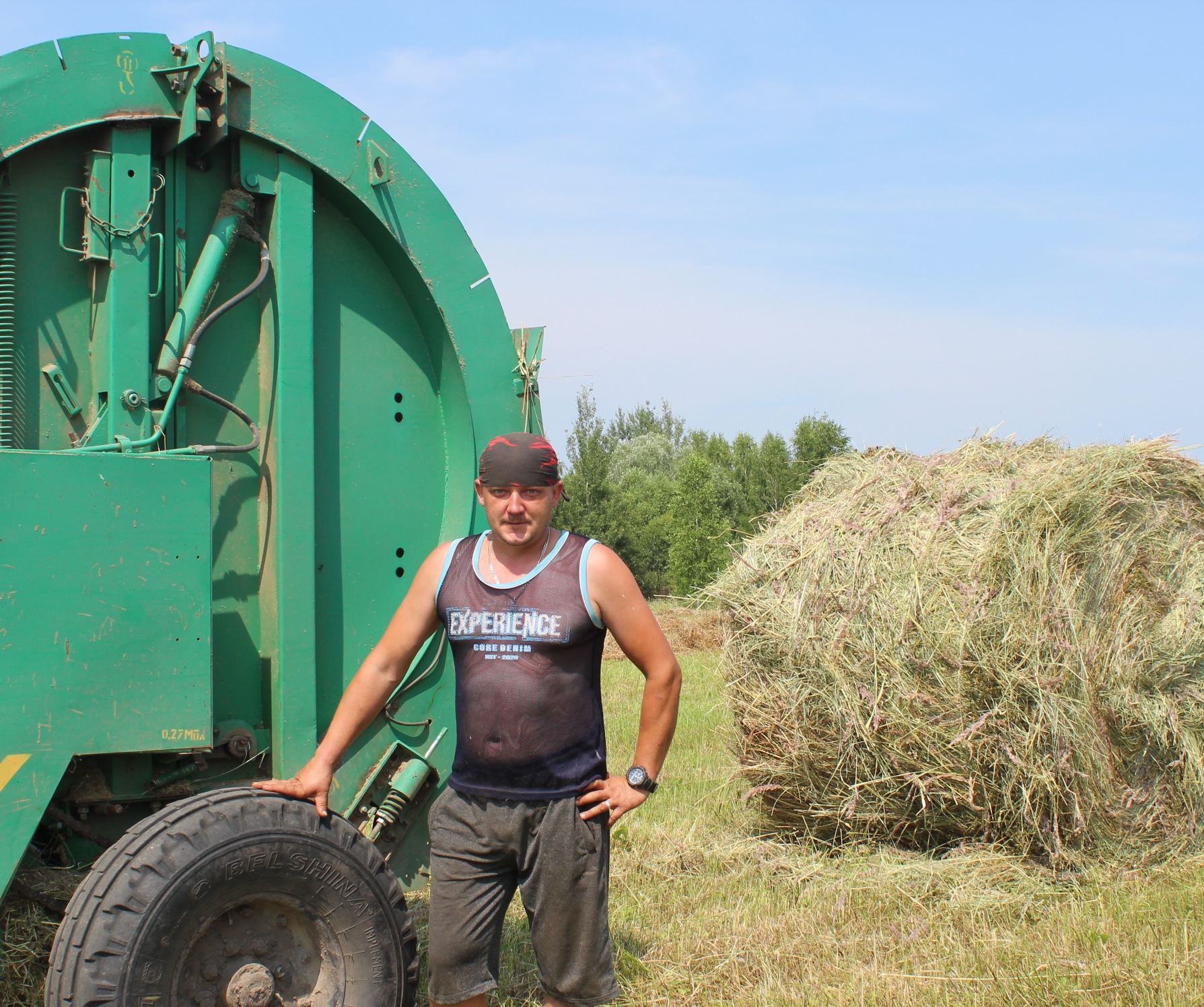 На полях пахнет травами, летними, настоянными жарким летним солнцем. Ряд за рядом ровными желто-зелеными дорожками из-под косилки Е-303, которой управляет «старожил» хозяйства Алексей Портной, ложится свежескошенная трава. Уже подсохшее разнотравье Олег Ермольчик на пресс-подборщике прессует в плотные рулоны. «В день получается выдать от 10 до 30 рулонов, но было и 42 рулона. Раз на раз не приходится. А всего уже за этот сезон натюковано около 250 тюков»,- подчеркнул Олег.