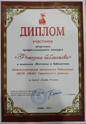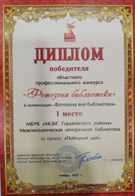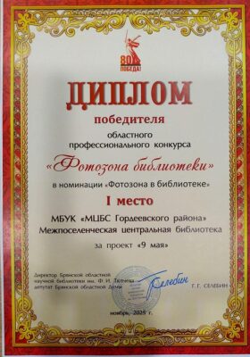 В Брянской областной научной библиотеке имени Ф.И. Тютчева подвели итоги ежегодного профессионального конкурса «Фотозона библиотеки». В этом году тема конкурса была посвящена Году защитника Отечества и 80-летию Великой Победы. По итогам заседания конкурсной комиссии были определены победители. И вновь библиотеки Гордеевского района стали победителями.