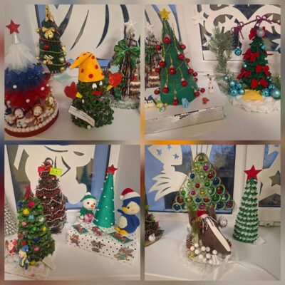 Разнообразные ёлочки, заснеженные домики, Лошади — символ 2025 года, новогодние игрушки, гномики, Дед Мороз и Снегурочка — всё сделано руками детей и родителей.