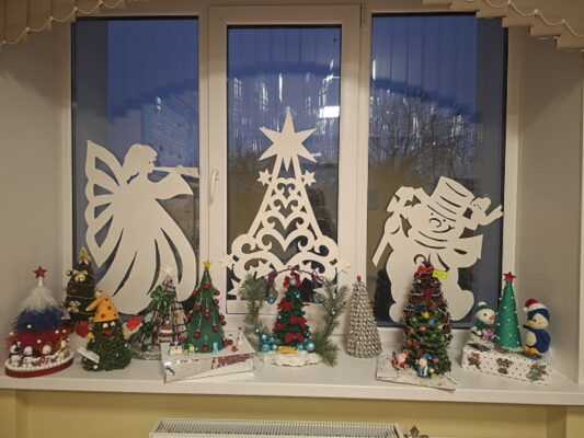Новогодние и зимние сюжеты семейного творчества расположили фойе второго этажа и внесли неповторимый элемент в новогодний интерьер школы.