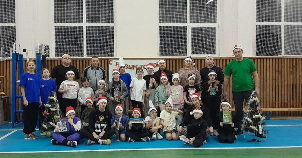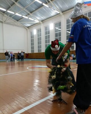 Вместе с детьми, занимающимися  в секции «Общая физическая подготовка», приняли участие в новогоднем мероприятии не только родители, но и старшие братья и сестры, тёти и даже дедушка. Участники разделились на две команды и поучаствовали в эстафетах: «Добудем елку», «Украсим ёлку», «Мешок с подарками»,