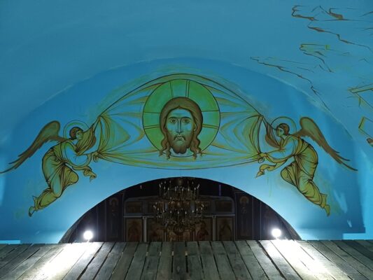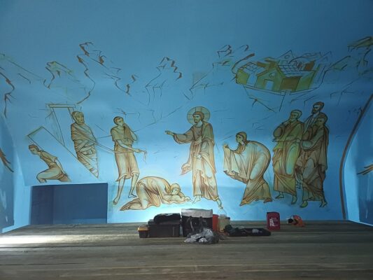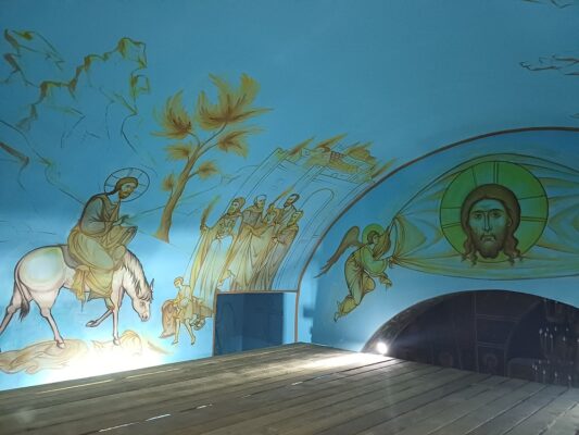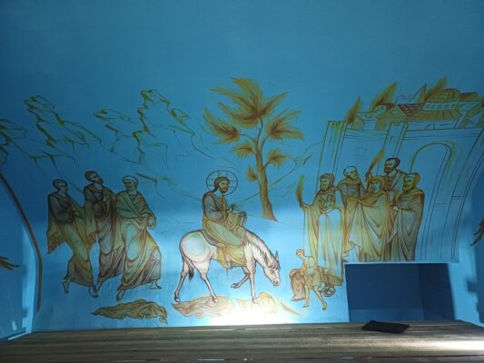 «Первые несколько дней потребовались на монтаж лесов в трапезной части храма. Затем приступили к рисункам. В своде два сюжета Евангельских событий: Воскрешение Лазаря и Вход Господень в Иерусалим. Согласно Евангелию событие, которое в христианстве связано с чудесным воскрешением праведного Лазаря — это последнее великое чудо, совершенное Христом в Его земной жизни. Как Иисус Христос воскресил Лазаря через четыре дня после его погребения, так и каждый из нас будет воскрешен после смерти.
