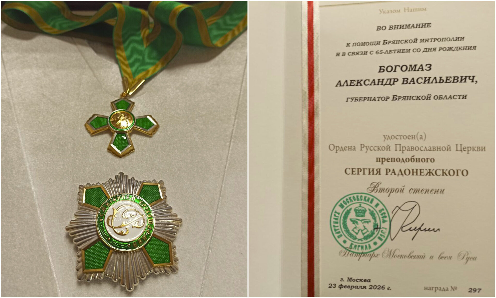 Губернатора Брянщины наградили орденом преподобного Сергия Радонежского II степени